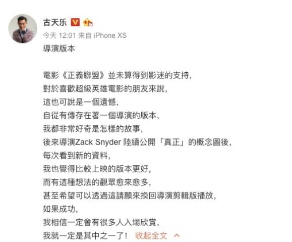 3月26日,超級英雄影迷古天樂表示希望看到《正義聯盟》導演剪輯版。稱對《正義聯盟》上映版反響不佳而感到遺憾,自從有傳存在著另一個導演版本,我就非常好奇是怎樣的故事。后來導演扎克·施奈德陸續公開‘真正’的概念圖后,每次看到新的資料,看到導演剪輯版的新資料后,覺得比上映版好,如果能發行,很多影迷包括他一定會觀看。這一看就是當時被院線版氣的不輕!